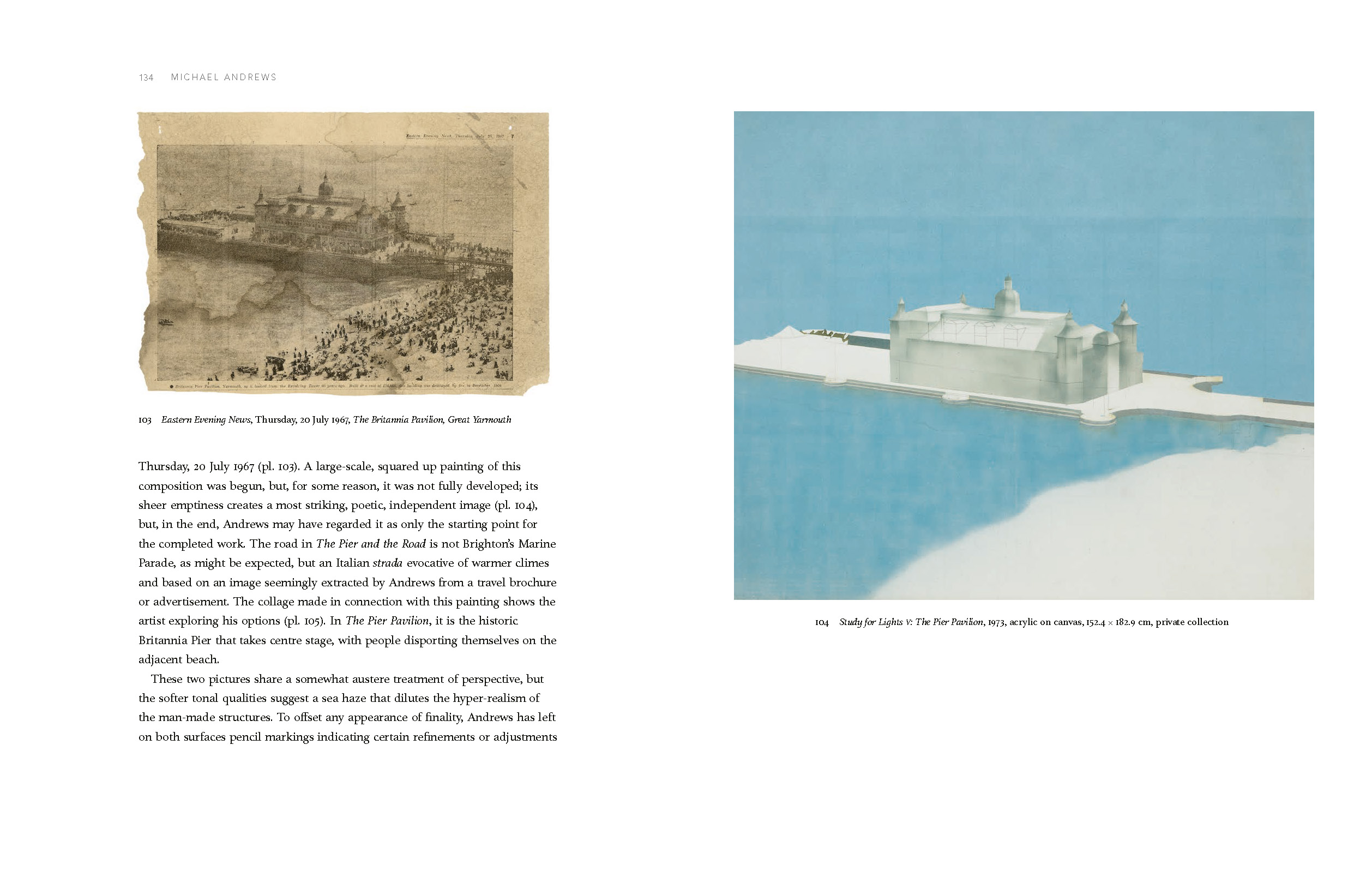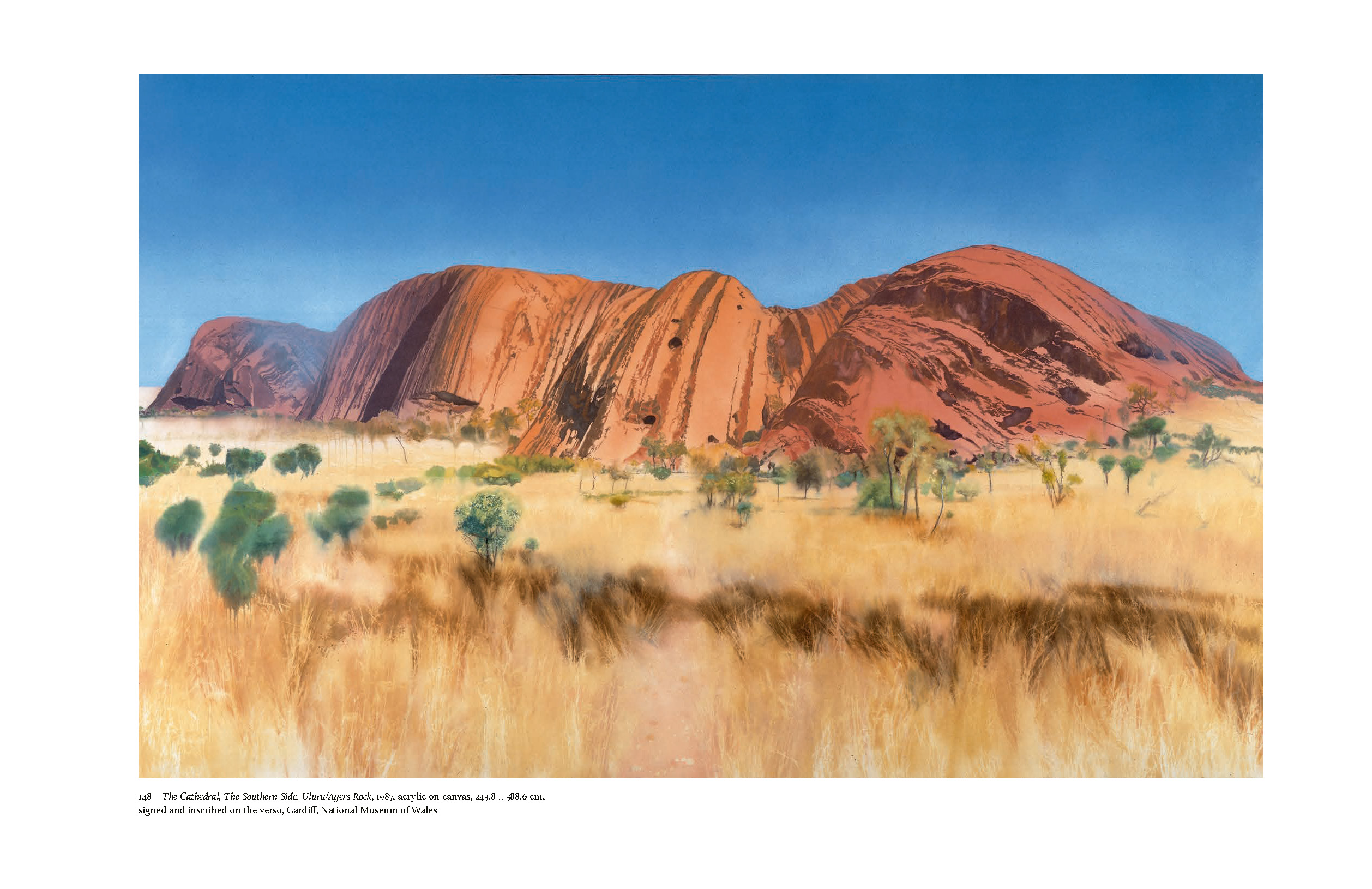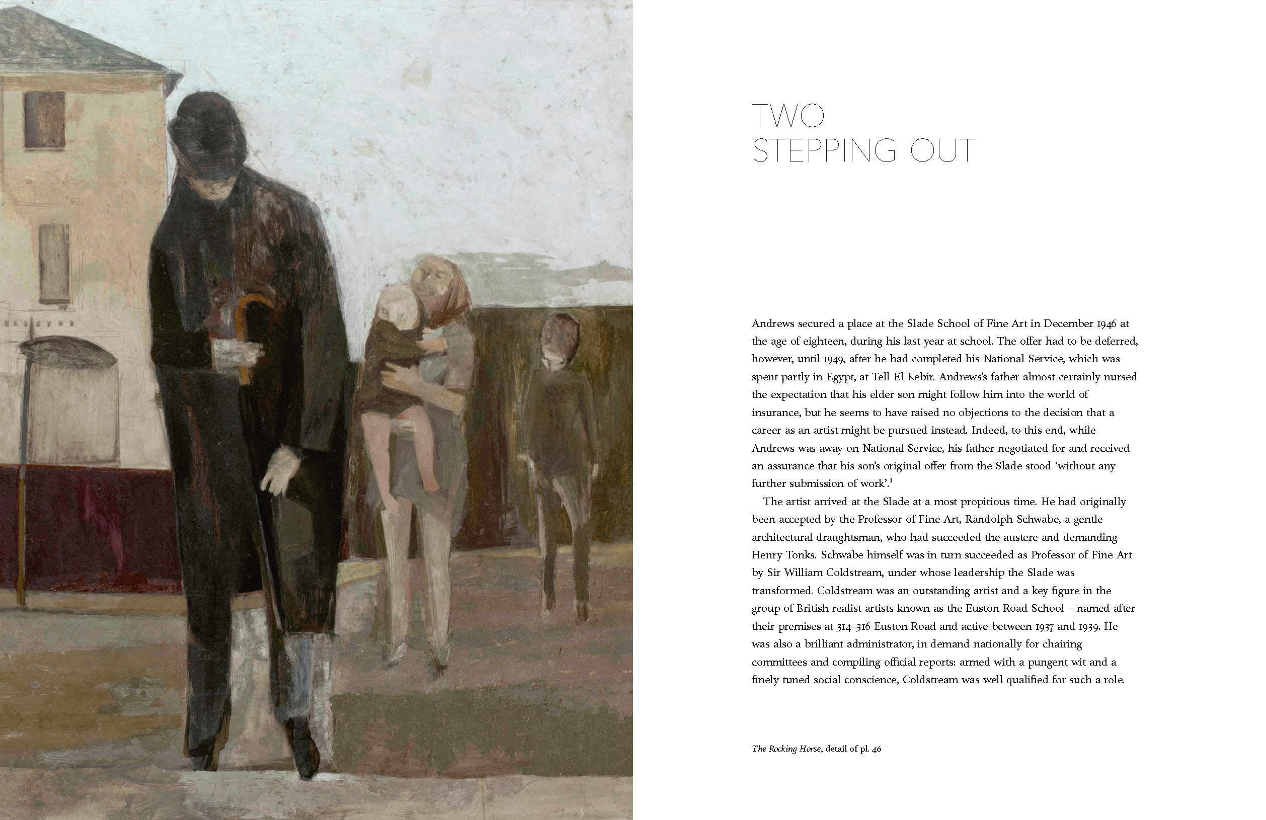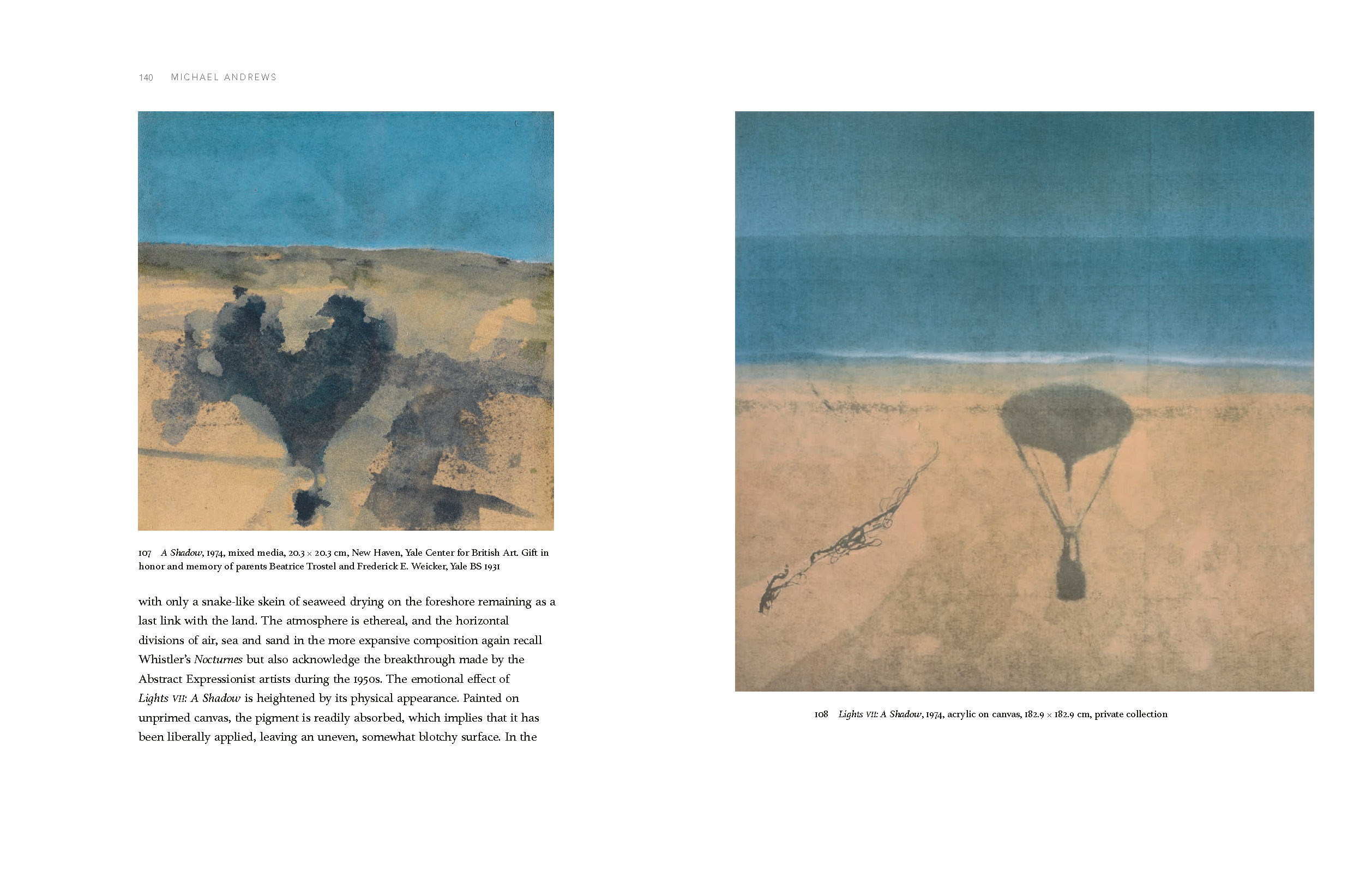 His early figurative paintings, dating from the 1950s and 1960s, were directly inspired by the political and social changes associated with post-imperial Britain, but, from the 1970s, Andrews began to pursue a wider range of themes arising from his growing interest in philosophy and psychology, as revealed in his two great series of works, Lights I–VII (1970–74) and School I–IV (1977–8). Inspired also by his home county of Norfolk, he was increasingly engaged with landscape painting, often on a large scale, and made annual excursions to Scotland, extending over two decades, and a memorable trip to Australia in 1983, when he explored Uluru/Ayers Rock and Kata Tjuta/Mount Olga. His comparatively small output concluded with three depictions of the River Thames begun in 1992, just before he was diagnosed with cancer; as such, these works have the profundity of an allegory of life.